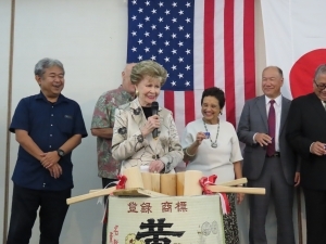 ルー・レオン・ゲレーロ知事、フランク・ブラス議会議長、ラルフ・スガンベリ・ジェームズ・モイラン連邦下院代議員上級顧問から、祝辞とともに上田総領事に対し、顕彰状、議会決議書がそれぞれ手交されました。鏡割りが行われ、マデリン・ボダリオ・グアム知事ワシントンD.C.リエゾン事務所長が乾杯の挨拶を行いました。